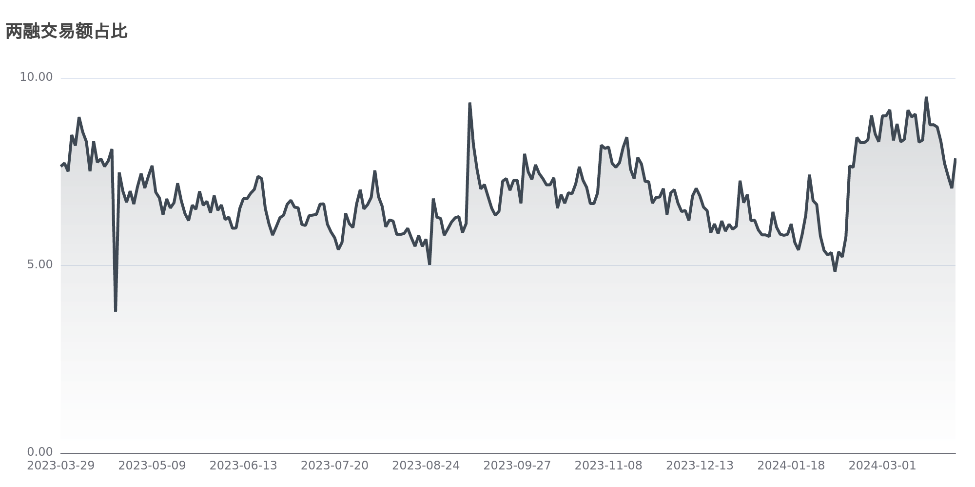 今日该指标值为7.86%,目前该指标处于近一年较高区间,认为当前A股市场相对较强。反映场内投资者借钱炒股的杠杆水平,该指标越高说明杠杆水平越高,即投资者认为当前市场较强,反之则说明投资者认为市场相对较弱,因而与上证指数存在较强的正相关性。